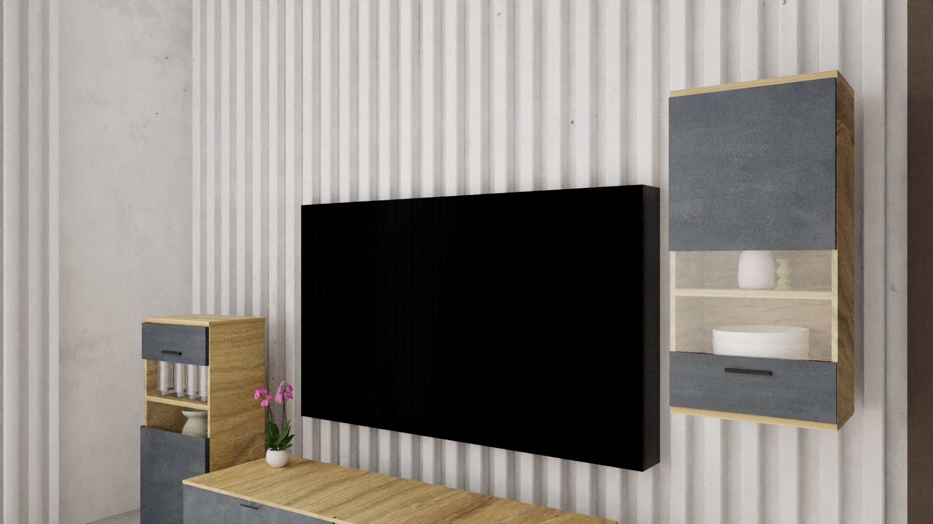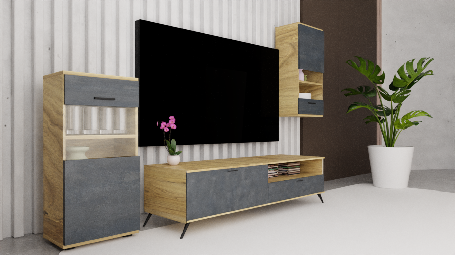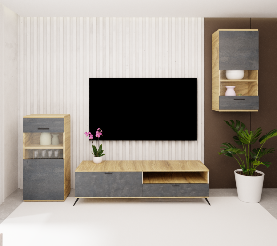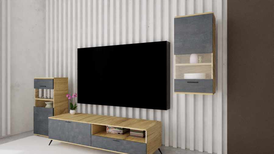 Κατασκευασμένη από ελληνική μελαμίνη υψηλής ποιότητας, η σύνθεση συνδυάζει αντοχή και μοντέρνο design, προσφέροντας ένα ολοκληρωμένο αισθητικό αποτέλεσμα που ταιριάζει σε κάθε σύγχρονο σαλόνι.