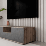 Το σύνθετο σαλονιού TV-ECO 803 σε εκλεπτυσμένη απόχρωση σταχτί συνδυάζει μινιμαλισμό και υψηλή αισθητική. Η εντυπωσιακή λεπτομέρεια της μαύρης πέτρας προσθέτει μια πολυτελή πινελιά, δημιουργώντας ένα κομψό σημείο εστίασης στον χώρο.